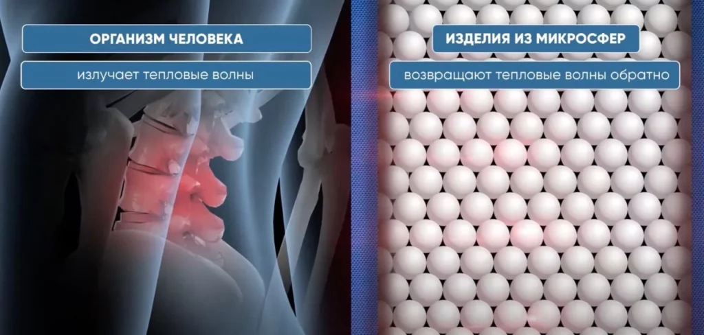 Так вот микросферы, усиливают этот эффект в сотни раз. Они собирают тепло тела, и как зеркало отражают его обратно в организм. Бережно прогревая суставы и органы на 1-2 градуса, на глубину до 8 сантиметров.